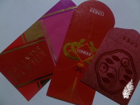 A quick assessment of this year’s ang pows from the 3 brands – Clinique’s and Estee’s this year doesn’t impress as much as last year’s. Estee’s has a geometric design with the words “Be Gifted” on it which is kind of appropriate, I suppose but kind of lacks the Chinese New Year feel. I like Clinique’s ang pow the least because the paper itself is the thinnest of the three and the design is just so-so.