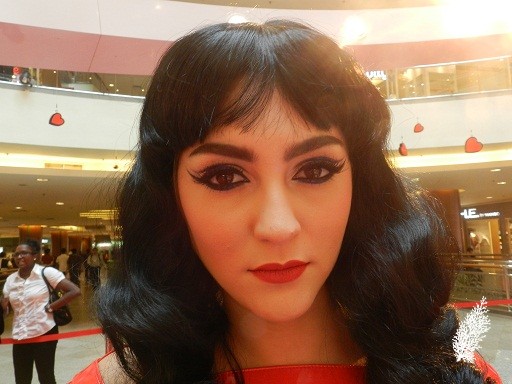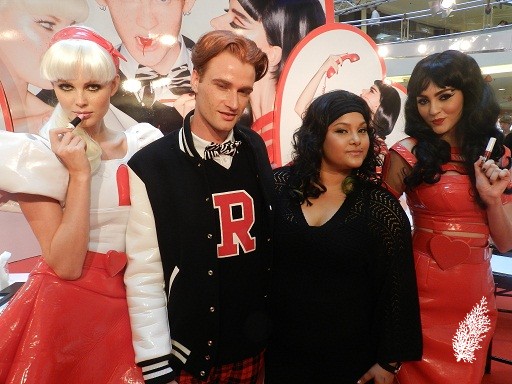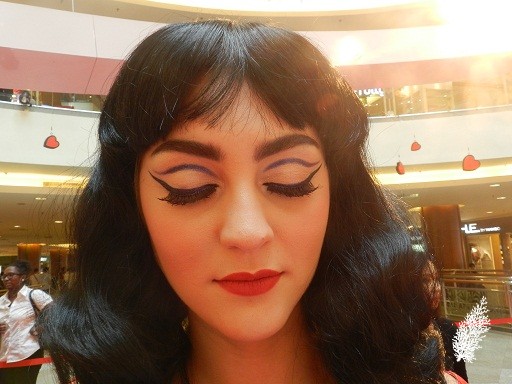 Spoiled Rich and Ron Ron Run shadows from the Veronica eye shadow palette were used. On cheeks are Prom Princess Blush and Veronica’s Blush Pearlmatte Face Powder. On lips are Ronnie Red Lipstick and Strawberry Malt Lipglass (on centre of lips).