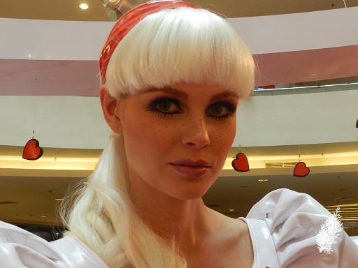 Lingering Eyebrow Crayon was used to create freckles and to intensify Betty’s natural freckles. Cream Soda Powder Blush and Flatter Me Pearlmatte Face Powder were mixed together. On lips are Girl Next Door Lipstick and Stay Sweet Lipglass.