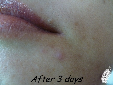 I had 2 spots, one on my upper lips and the other on my chin. I used Visionnaire on the 2 spots without any other serum or acne treatment. By the 3rd day, the spot on my upper lip had become less visible and the redness caused by the inflammation on my chin had subsided, not completely but skin became much smoother and the bump had decreased in size.